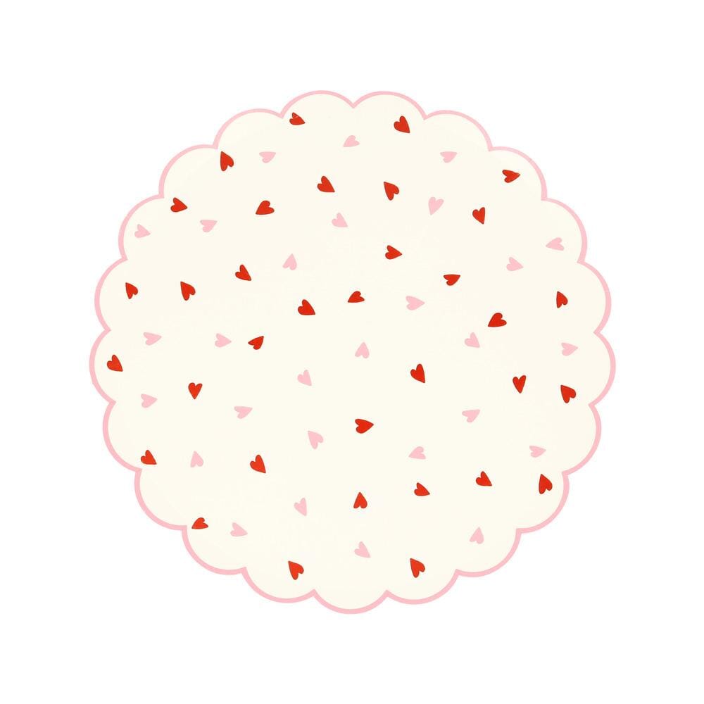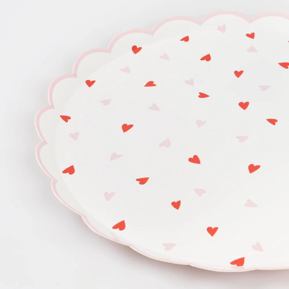 Assiettes à motifs de cœurs de Meri Meri. Le rose et le rouge forment une combinaison de couleurs parfaite, tendance et romantique. Ces assiettes en carton sont ornées de petits cœurs et d'un bord festonné pour un superbe look vintage.
