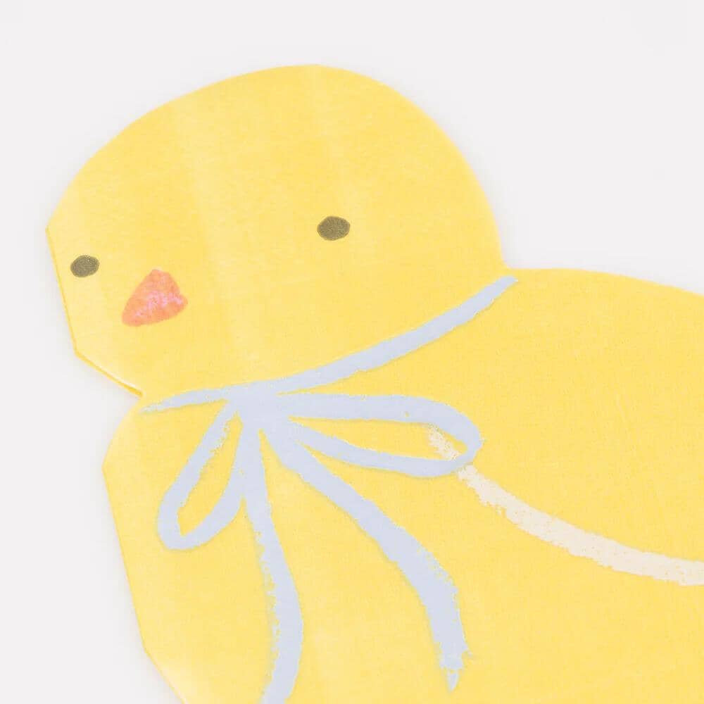 Serviettes en forme de poussin de Meri Meri. Apportez une touche rustique et charmante à votre table de Pâques avec ces adorables serviettes en papier. Ornées d'un poussin mignon avec un nœud bleu, elles revisitent avec fantaisie un motif printanier classique. Parfaites pour les petits comme pour les grands, elles sont non seulement décoratives, mais aussi idéales pour s'essuyer les doigts et la bouche. Associez-les à des tons pastel ou neutres doux pour une table à la fois joyeuse et élégante qui restera gravée dans les mémoires.