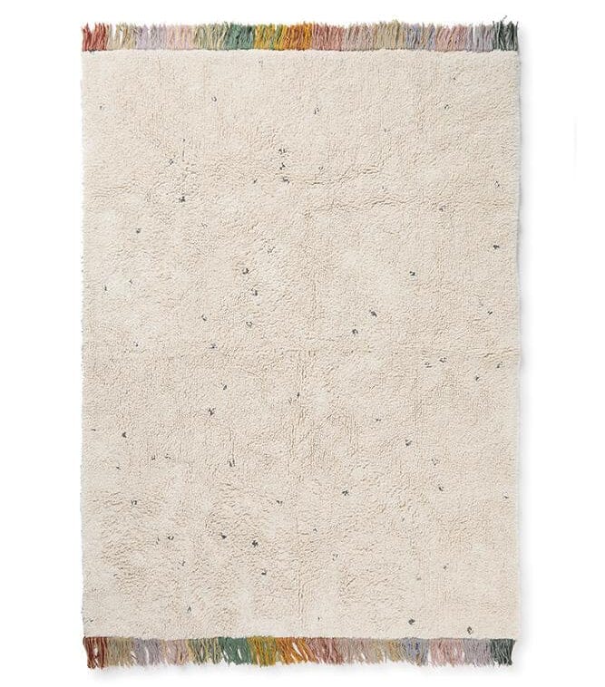 Wasbaar tapijt in de Stadust uitvoering van Lorena Canals. Dans tussen de sterren met dit prachtige tapijt. Een handgemaakt rechthoekig katoenen tapijt in natuurlijke kleur met kleine donkere stippen die sterrenstof in de uitgestrekte ruimte nabootsen. Het tapijt is afgewerkt met korte franjes aan de randen in verschillende kleuren.