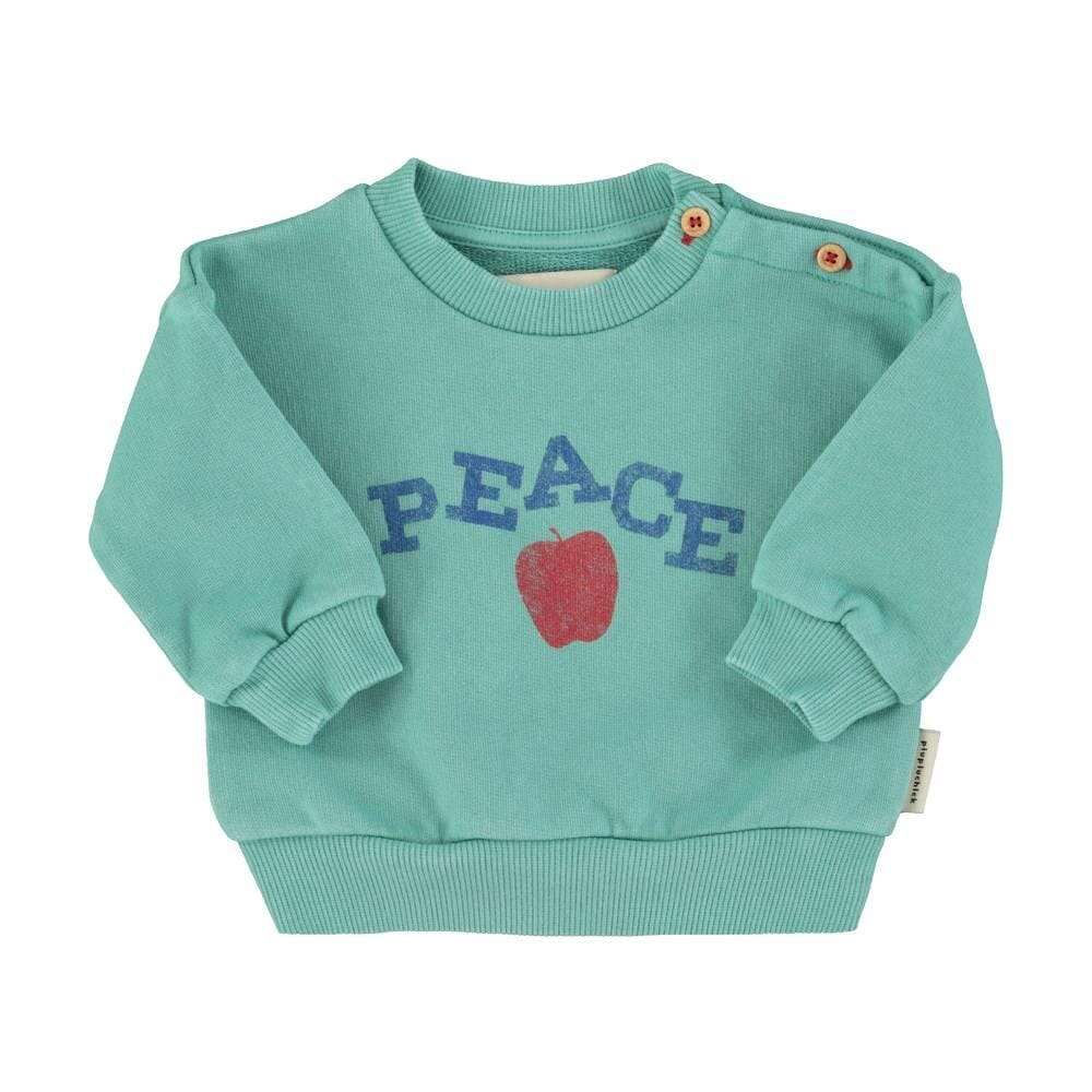 Sweater in biologisch katoen van Piupiuchick. Dit sweatshirt heeft een appel op de voorkant en de letters "PEACE". Op de schouder zitten houten knoopjes voor makkelijk aan- en uittrekken.