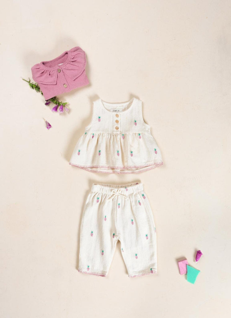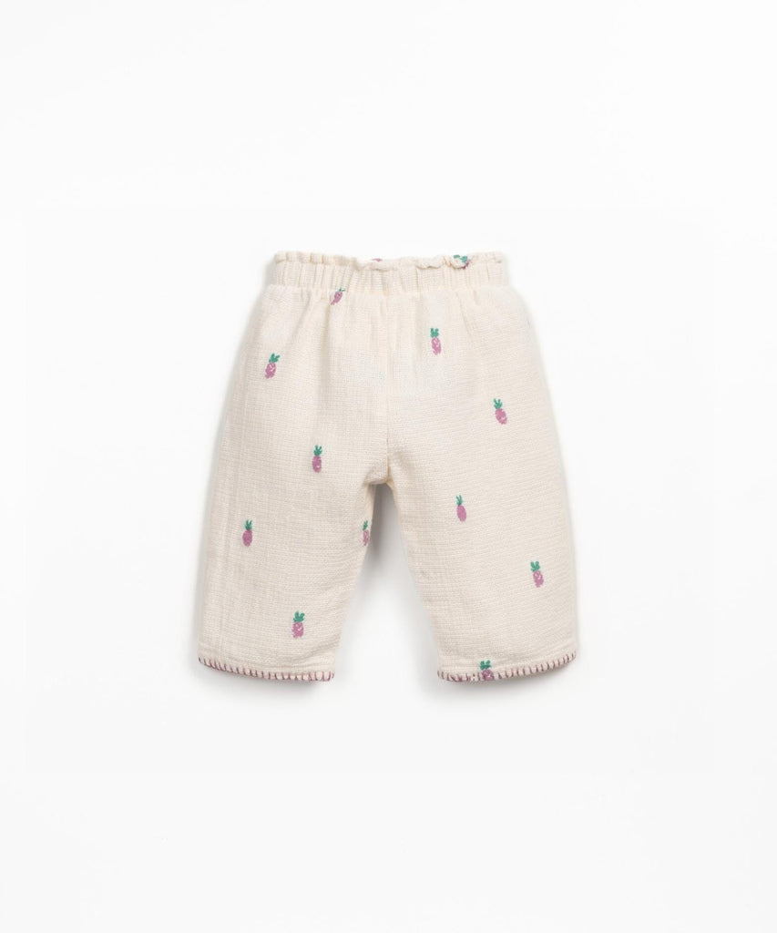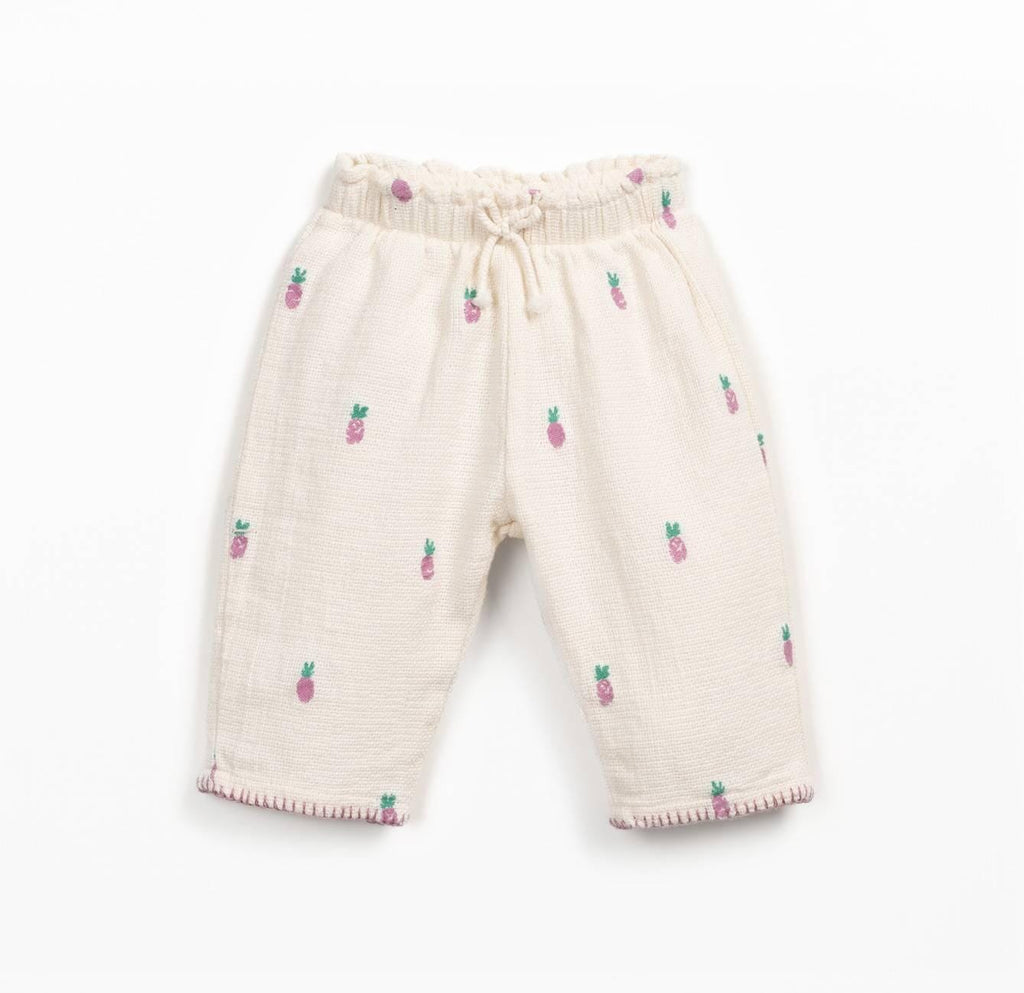 Broek met ananas-motief van Play Up. Deze geweven broek heeft een elastische taille en een sierkoordje vooraan. Onderaan zorgt de contrasterende naad voor een leuk accent.