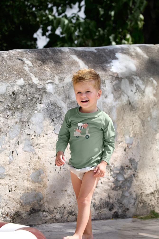 UV-zwemshirt met lange mouwen in de Scooter Dog Green uitvoering van Lässig. Zomer, zon, ijs! Deze rashguard met lange mouwen en UV-bescherming 60 brengt een vleugje Italië naar kleine zonnekloppers en garandeert zorgeloos plezier in het water.