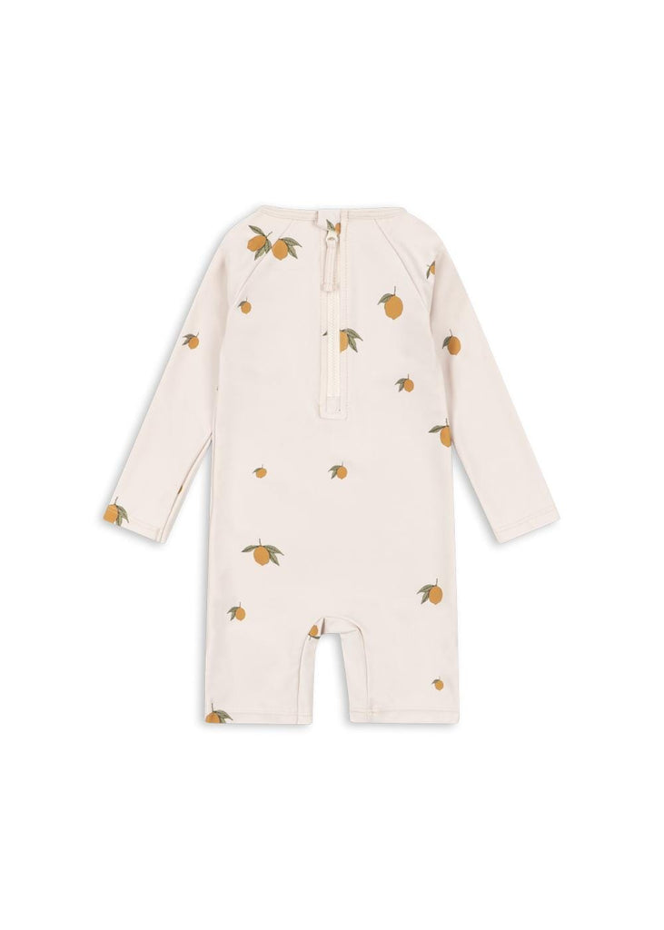 Combinaison de bain Aster, imprimé « Mon grand citron », de Konges Sløjd. Ce maillot de bain à manches longues offre une protection optimale contre les rayons UV grâce à son indice de protection solaire maximal, SPF 50+.
