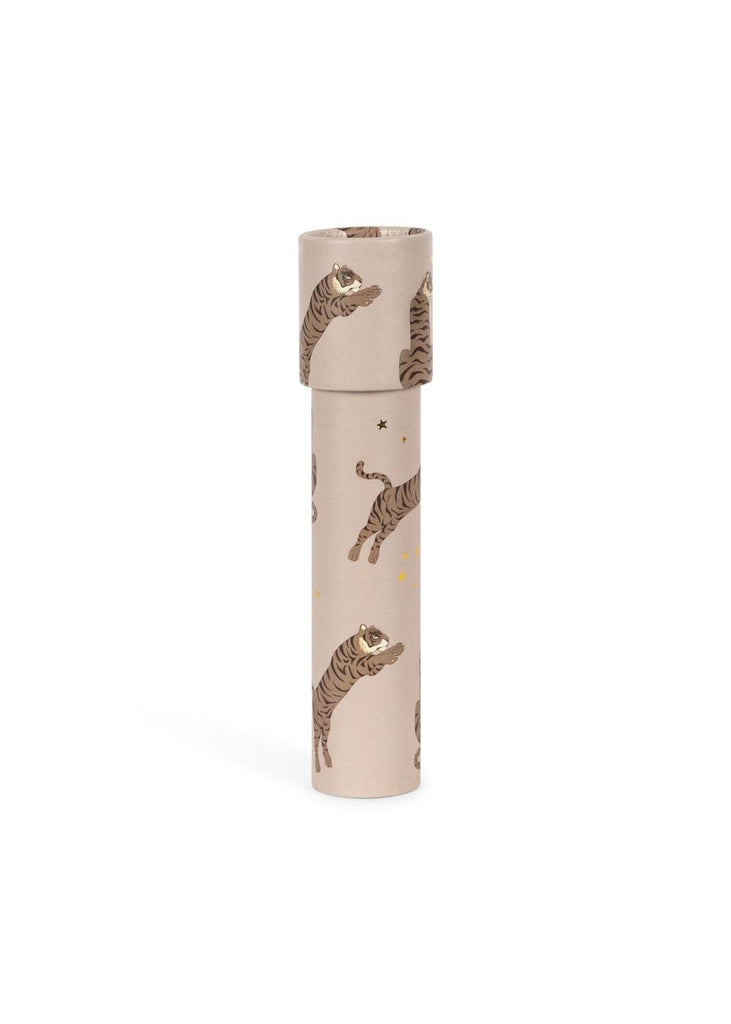 Caleidoscoop in de print Tiger van Konges Sløjd. Kijk naar binnen en ervaar de patronen en kleuren die ontstaan door de reflecties van de spiegels en de gekleurde parels binnenin.