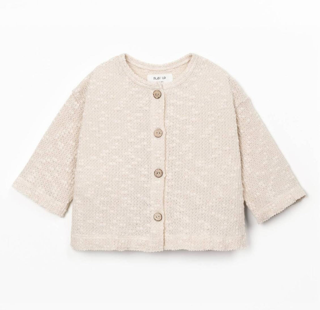 Cardigan met mooie knitwearstructuur van Play Up. Deze cardigan heeft een ronde halslijn, driekwartmouwen, licht afhangende schouders en een sluiting met kokosnootknopen. Hij is gemaakt uit heerlijk zachte, licht getextureerde stof. Hij bevat Re(Play)-garen dat afkomstig is van de recycling van Play Up's post-productie afval.