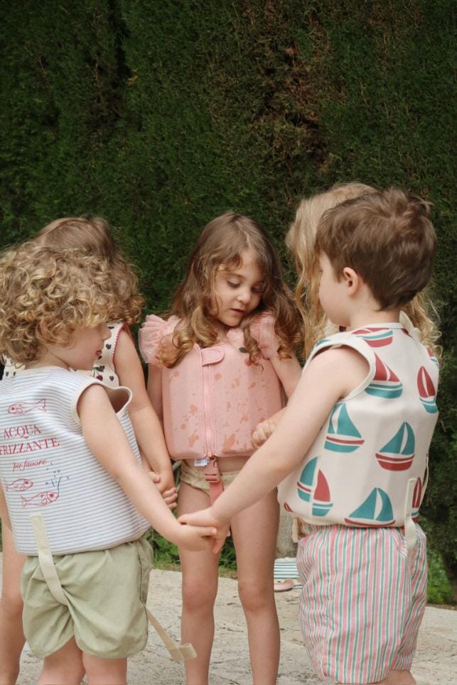 Ellis zwemvest in de print Stripe bluie van Konges Sløjd. Dit vest is het perfecte zwemaccessoire als je kleintjes net beginnen met spetteren. Het voegt natuurlijk drijfvermogen toe en helpt ze om zich op hun gemak te voelen in het water terwijl ze zelfstandig leren zwemmen. De zwemvesten zijn ontworpen met schuimrubberen sticks aan de binnenkant die kunnen worden aangepast aan de vaardigheden en behoeften van het kind. De drijfelementen kunnen gemakkelijk, stelselmatig worden verwijderd naarmate je kind zijn zwemvaardigheden ontwikkelt. Verwijder de sticks altijd per twee, te beginnen met 1 & 1, dan 2 & 2 enzovoort tot je kind volledig aangepast is aan het zelfstandig zwemmen.