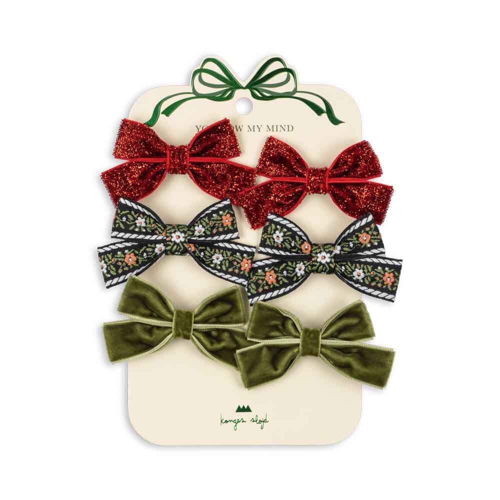 Kleine strikvormige haarspeldjes van Konges Sløjd. Met deze speldjes in fluweel, glitterstof en met geborduurd effect, voeg je makkelijk een feestelijke touch toe aan iedere outfit!