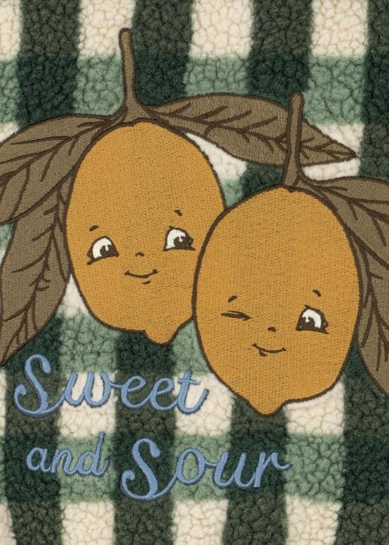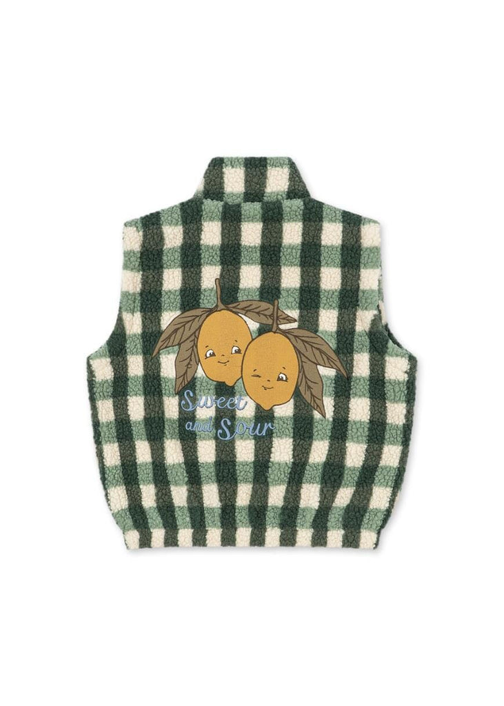 Mouwloos teddyvest met ruitjesprint van Konges Slojd. Dit vest heeft een zachte binnenkant van fleece en een hoge kraag.