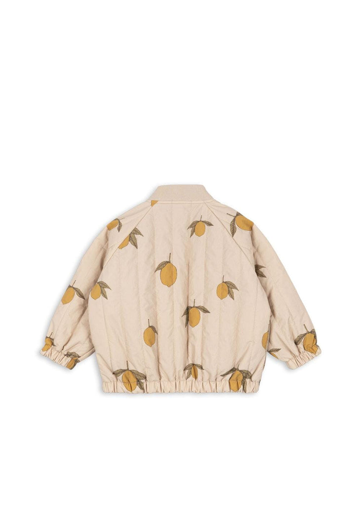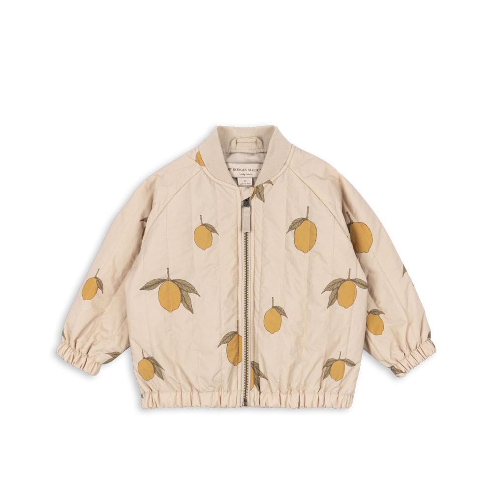 Bomberjas in de print Mon grand citron van Konges Sløjd. De Juno thermojack is een echte favoriet, met polyester vulling voor effectieve isolatie en een ademende, fluorvrije impregnering die het jack zowel winddicht als waterafstotend maakt. Op de rug staan twee bananen en een leuke slogan.