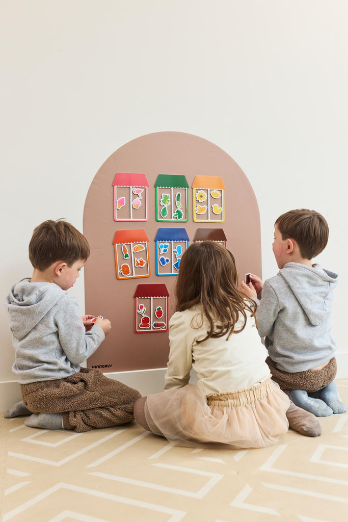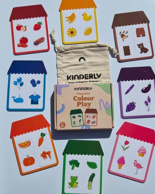 Puzzle magnétique de Kinderly, 8 maisons de couleurs différentes, chaque maison contenant 4 objets de la même couleur qui lui appartiennent. Une façon amusante et pratique pour les enfants d'apprendre les couleurs, de s'exercer au tri et d'améliorer leur capacité à résoudre des problèmes.