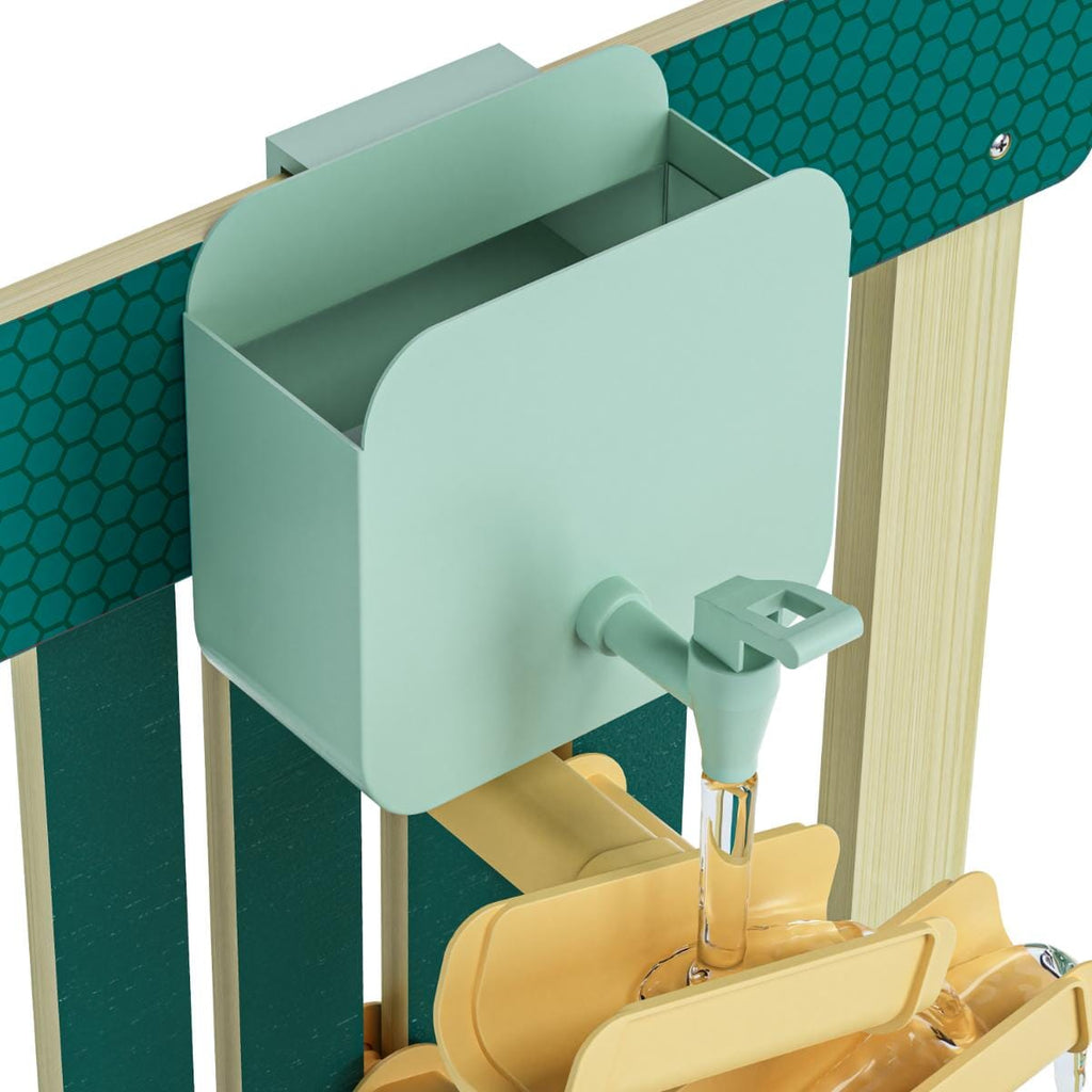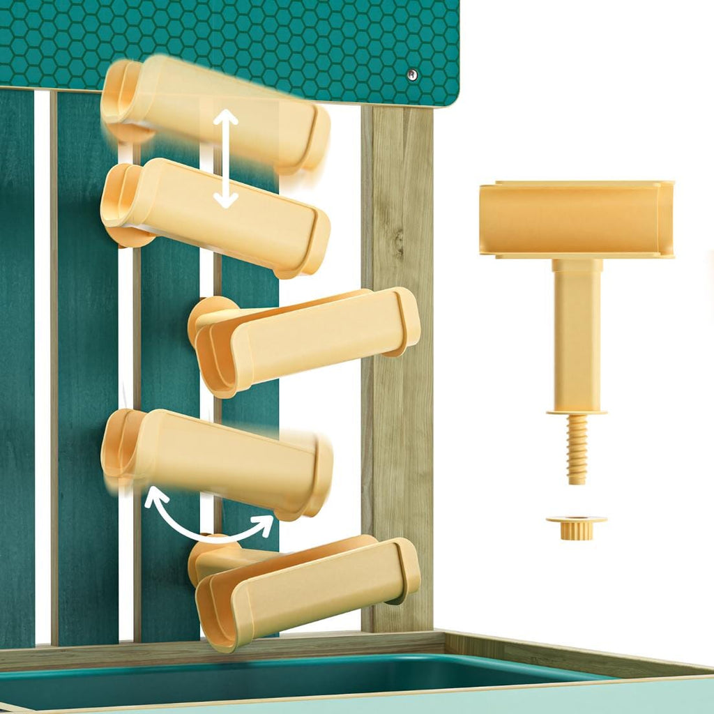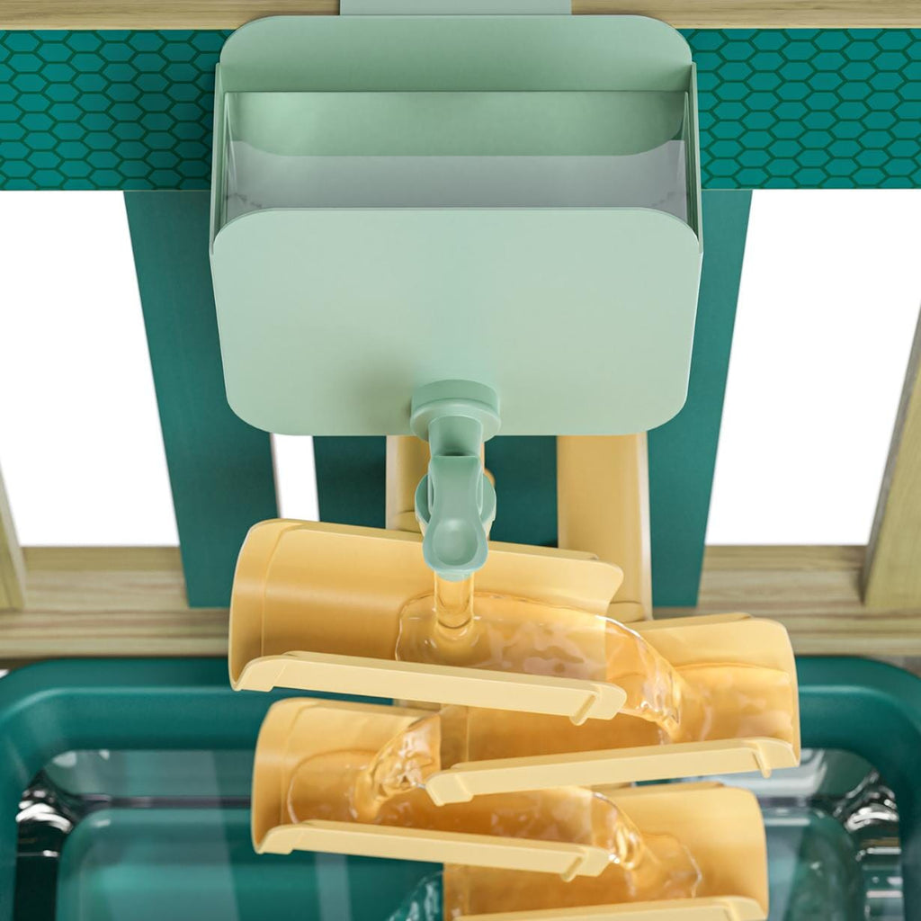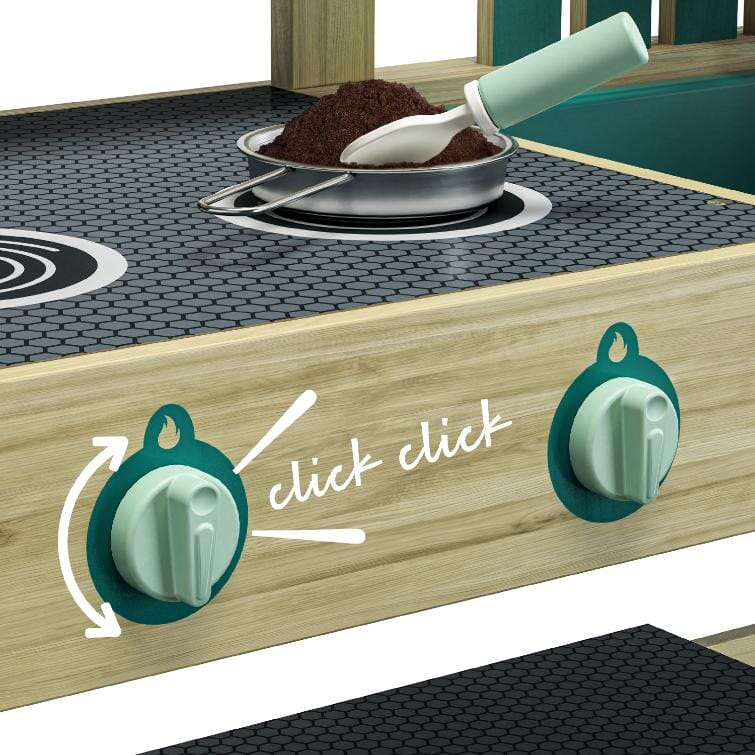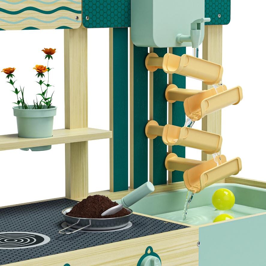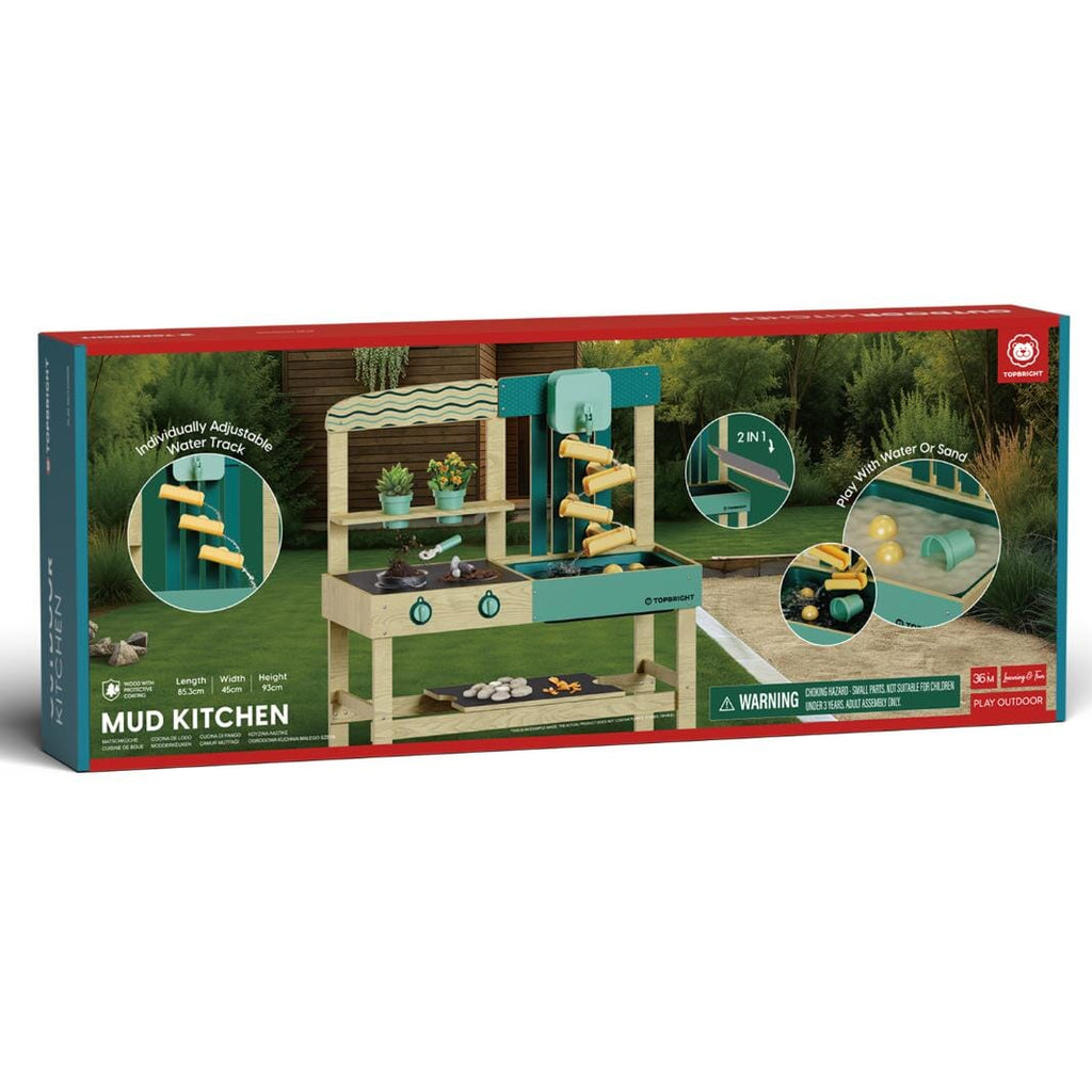 Modderkeuken van Topbright. Een tuin, een idee – en het avontuur kan beginnen. Met de Mud kitchen ontdekken kinderen vanaf 36 maanden een wereld vol fantasie, natuur en modderplezier. Of ze nu waterbanen bouwen, moddertaartjes bakken of soep maken met zand en bladeren – alles wat leuk is, kan hier. De modderkeuken is uitgerust met een wasbak met afdekplaat om te spelen met water of zand, een watertank, een verstelbare waterbaan, een kookplaat met draaiknoppen en zorgvuldig ontworpen accessoires. Gemaakt van weerbestendig hout is deze keuken perfect voor in de tuin, op het terras of op het balkon. Spelenderwijs ontwikkelen kinderen hun fijne motoriek, leren ze omgaan met natuurlijke materialen en ervaren ze hoe fijn het is om vrij en creatief buiten te spelen.