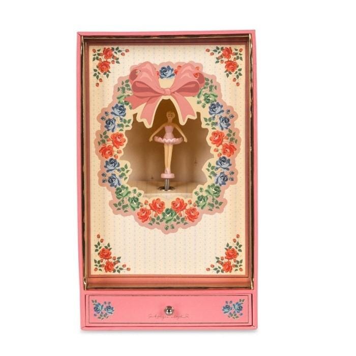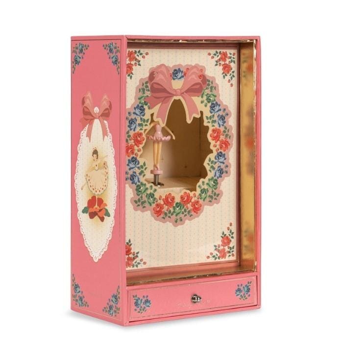 Schattige schatkist van Konges Sløjd met een ballerina in vintage stijl aan de binnenkant. Trek aan het lipje aan de achterkant van de doos om muziek, licht en beweging te activeren. Ideaal als mooie decoratie voor de kinderkamer.