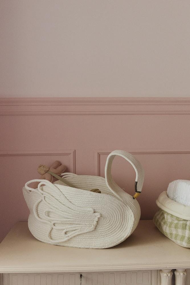 Opbergmand Swan van Lorena Canals. Breng een vleugje magie van het meer naar de kamer van je kleintje met deze zwanenmand. Volledig met de hand gemaakt van touw, is elke vleugel liefdevol geknoopt en zijn de afzonderlijke panelen zorgvuldig bevestigd om de vorm te creëren. De met de hand geborduurde snavel en de zachte blauwe basis – als kalm, speels water – maken hem perfect voor het opbergen van kleine schatten of als lief accent in elke hoek.