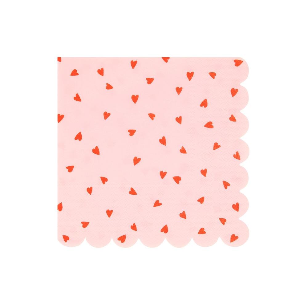 Servetten met hartjespatroon van Meri Meri. Roze en rood vormen de perfecte, trendy en romantische kleurencombinatie. Op deze servetten worden ze gecombineerd met kleine hartjes en een geschulpte rand voor een fantastische vintage look.