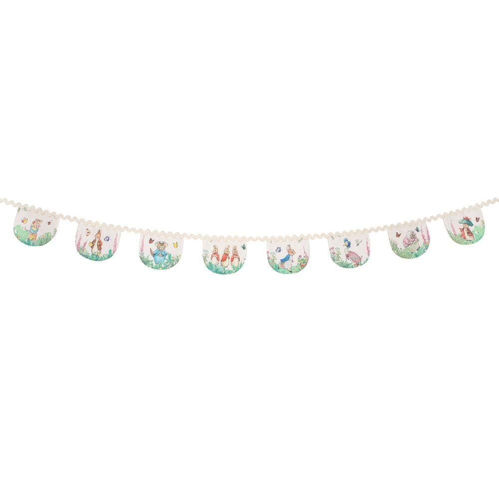 - 8 vlaggetjes van polykatoen met geschulpte rand, waarop Peter Rabbit en zijn vrienden te zien zijn.