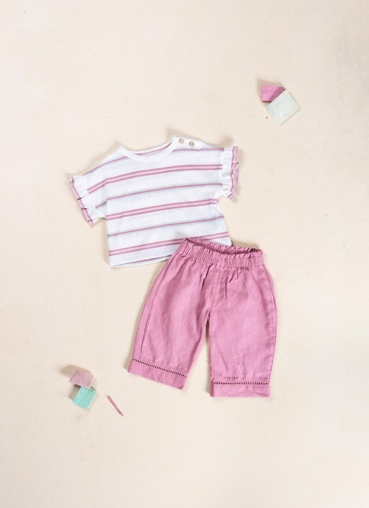 T-shirt met roze strepen van Play Up. Dit T-shirt heeft een ronde halslijn, korte mouwen met volant en een schouderopening met knoopjes van kokosnoot. Het is gemaakt van een heerlijk luchtige mix van linnen en katoen.