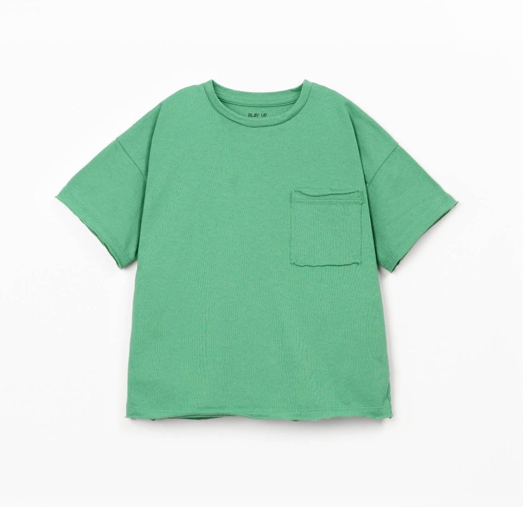 T-shirt in mintgroen van Play Up. Dit T-shirt heeft een ronde halslijn, korte mouwen en een borstzakje.