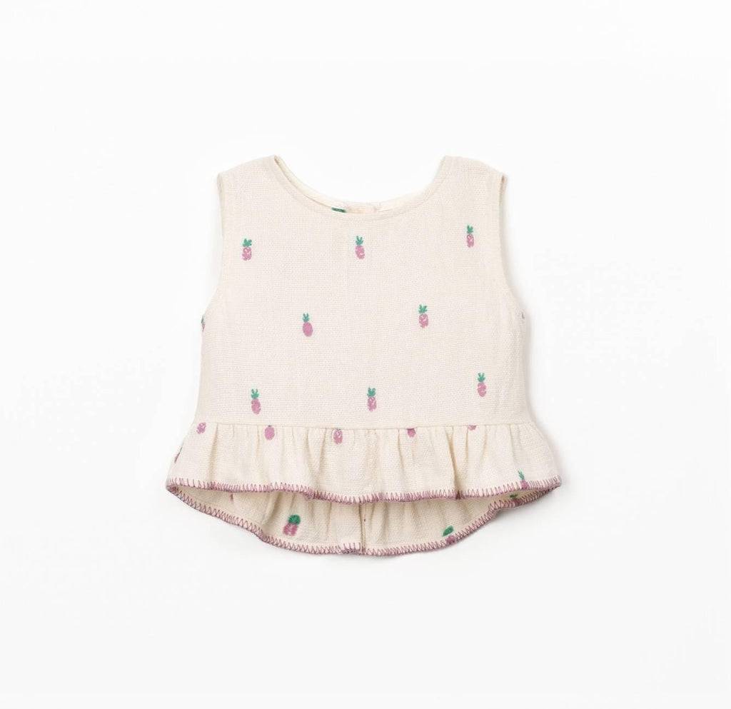 Top met ananas-motief van Play Up. Deze geweven top zonder mouwen heeft een ronde halslijn, een opening met knoopjes van kokosnoot op de rug en een gefronst effect in de taille.