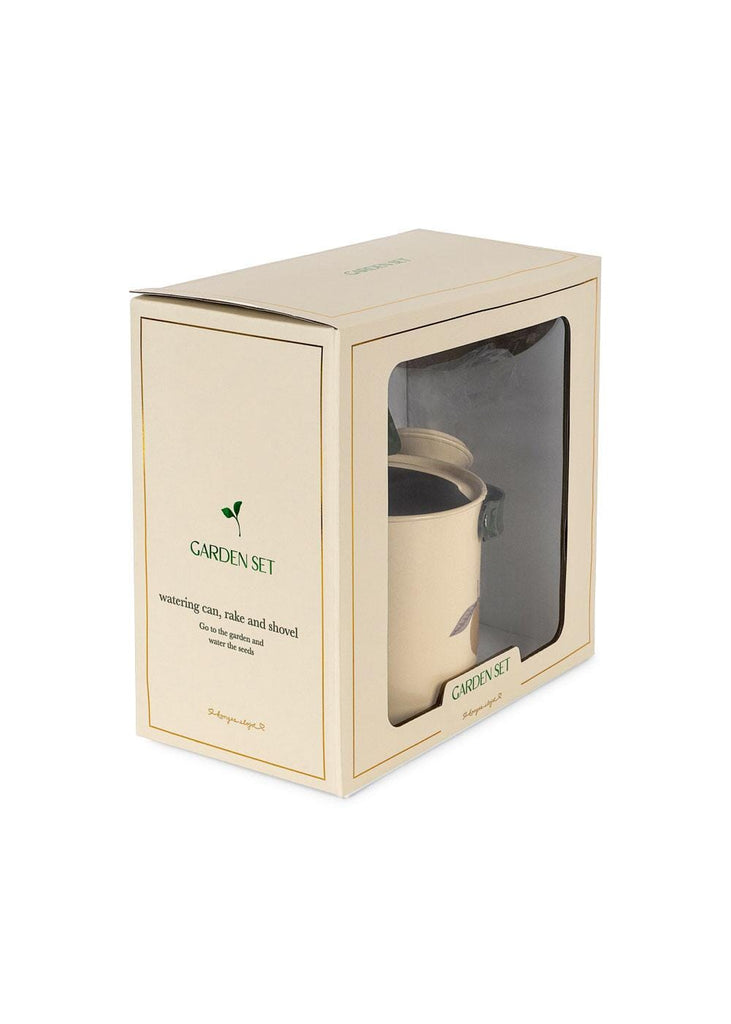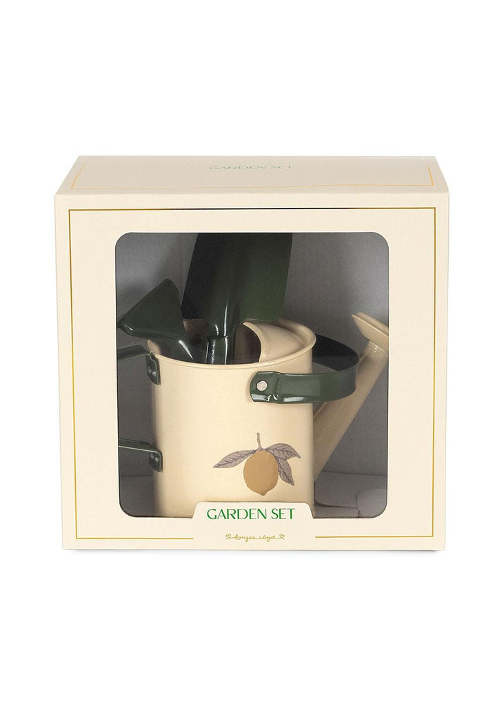 Tuinset in het thema Lemon van Konges Sløjd. Deze set voor alle beginnende tuiniers bevat een een gieter, een schepje en een kleine hark.