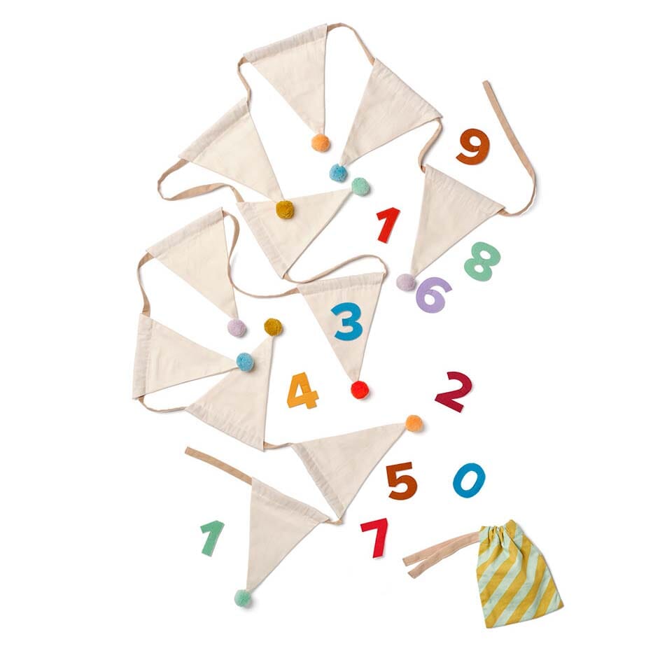 Verjaardagsvlaggenslinger van Kid's Concept. Deze vlaggetjesslinger is een tijdloze decoratie, perfect om jaar na jaar tevoorschijn te halen om speciale momenten te vieren. Hij is gemaakt van zacht katoen en heeft kleurrijke vlaggetjes met pompons aan het uiteinde, die een vrolijke toets geven aan uw feest. Een van de vlaggetjes heeft een klittenbandje waar u de meegeleverde cijfers 0-10 op kunt bevestigen, zodat u de slinger elk jaar gemakkelijk kunt aanpassen.