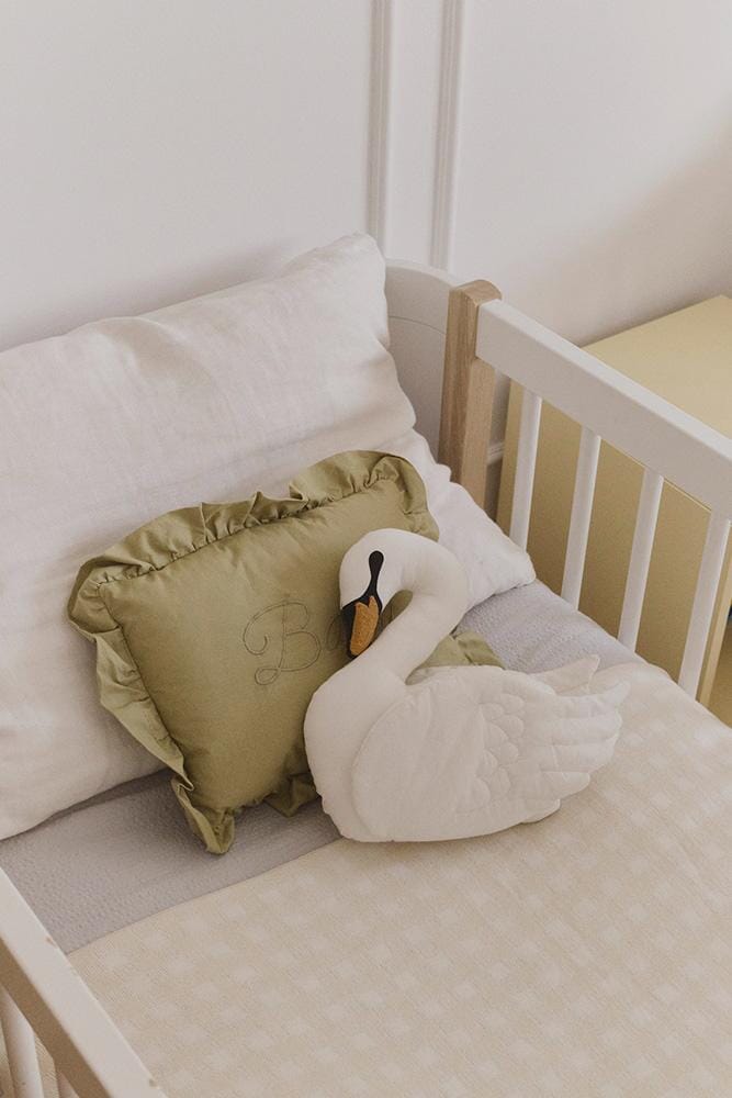 Wasbaar kussen Swan van Lorena Canals. Geef de kamer van je kleintje een upgrade met dit prachtig kussen in zacht ivoor. Met delicate zwarte zeefdrukdetails en een oranje snavel die geborduurd en lichtjes verhoogd is voor extra textuur, geven de gestikte vleugels het kussen extra karakter. Dit kleine, gezellige kussen is perfect voor in de wieg en geeft elke hoek een subtiel, speels accent.